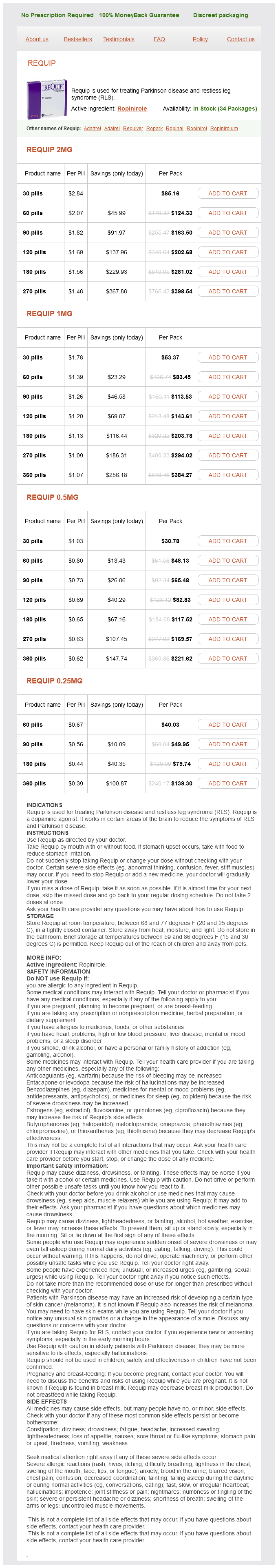 Requip packs: 30 pills, 60 pills, 90 pills, 120 pills, 180 pills, 270 pills, 360 pills