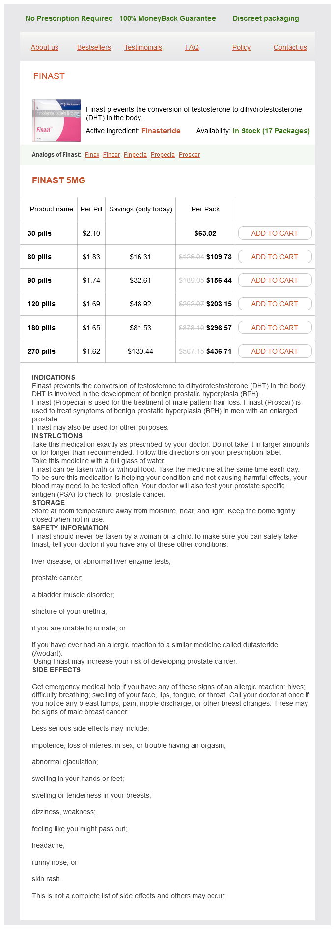 Finast packs: 30 pills, 60 pills, 90 pills, 120 pills, 180 pills, 270 pills