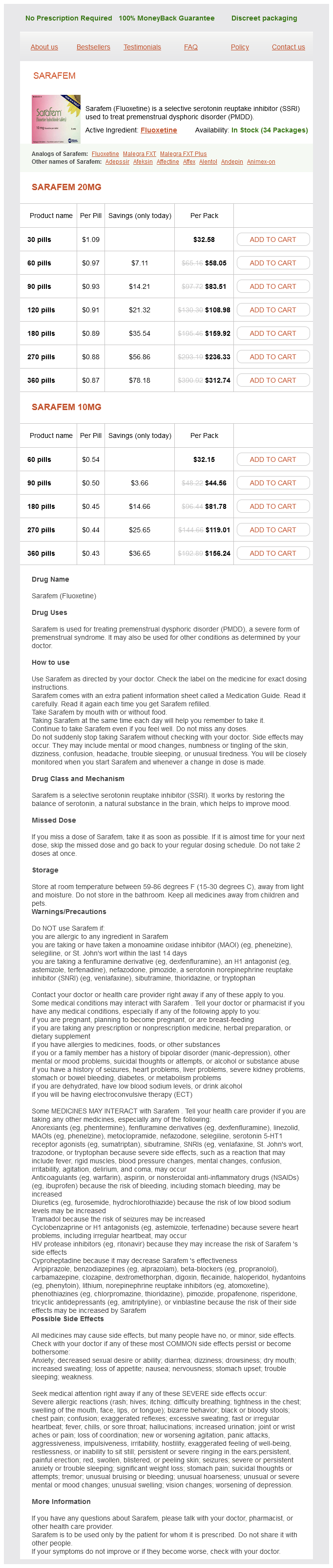 Sarafem packs: 30 pills, 60 pills, 90 pills, 120 pills, 180 pills, 270 pills, 360 pills