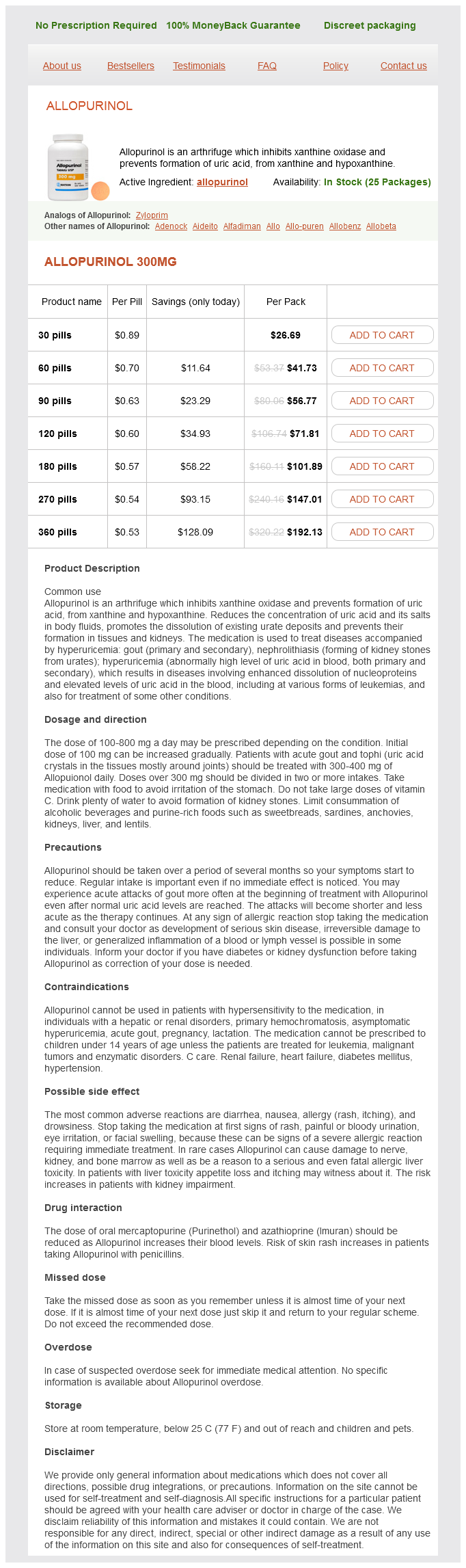 Allopurinol packs: 30 pills, 60 pills, 90 pills, 120 pills, 180 pills, 270 pills, 360 pills