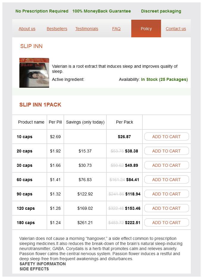 Slip Inn packs: 10 caps, 20 caps, 30 caps, 60 caps, 90 caps, 120 caps, 180 caps