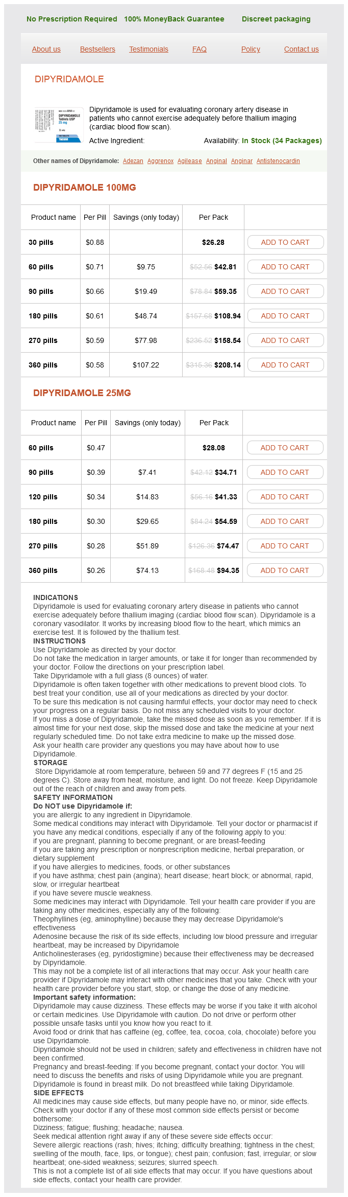 Dipyridamole packs: 30 pills, 60 pills, 90 pills, 180 pills, 270 pills, 360 pills, 120 pills