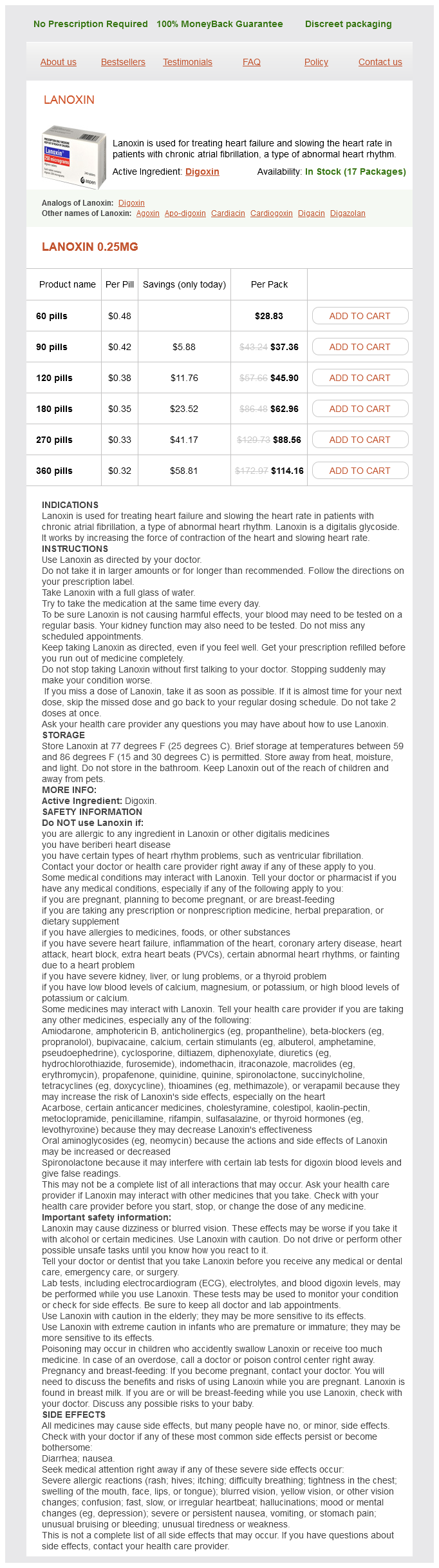 Lanoxin packs: 60 pills, 90 pills, 120 pills, 180 pills, 270 pills, 360 pills