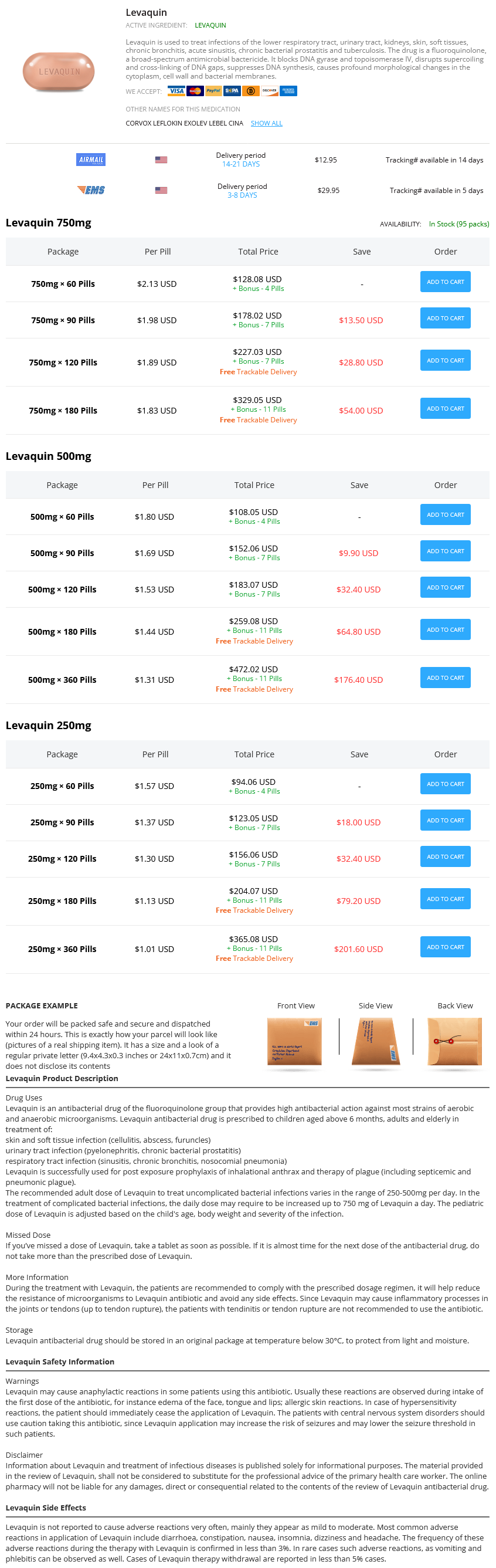 Levaquin packs: 60 pills, 90 pills, 120 pills, 180 pills, 360 pills