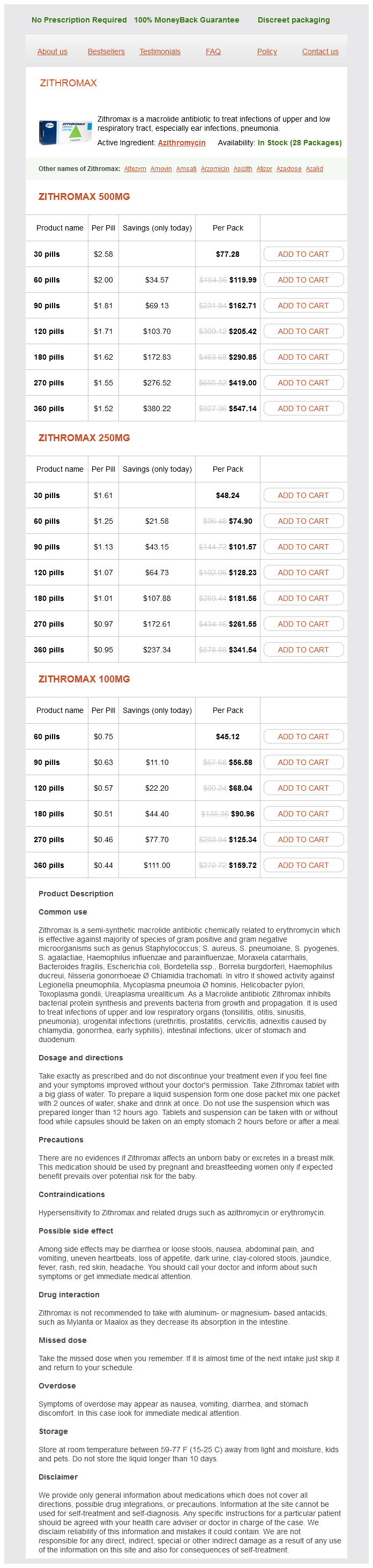 Azithromycin packs: 30 pills, 60 pills, 90 pills, 120 pills, 180 pills, 270 pills, 360 pills