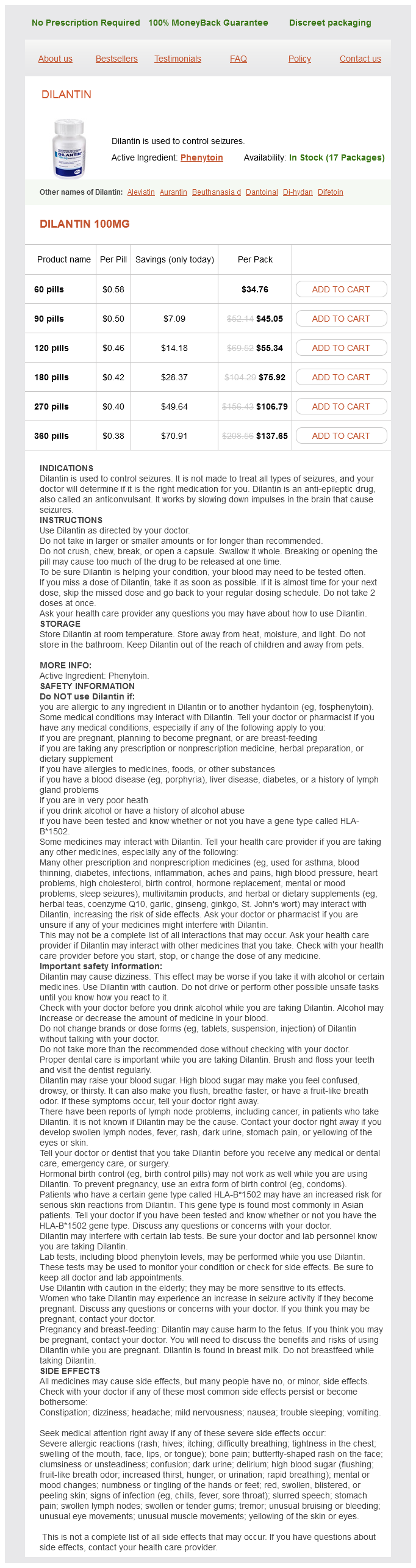 Phenytoin packs: 60 pills, 90 pills, 120 pills, 180 pills, 270 pills, 360 pills